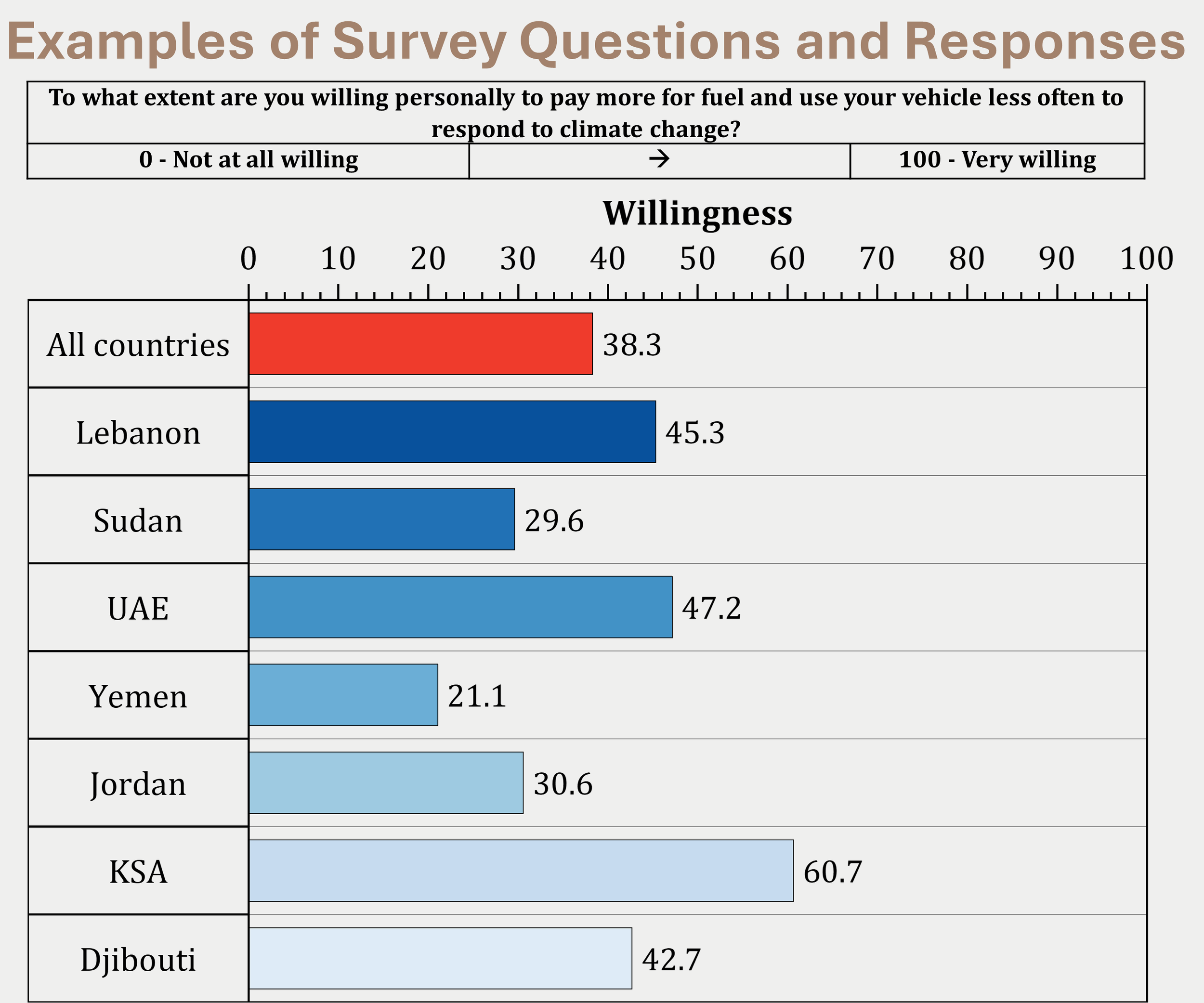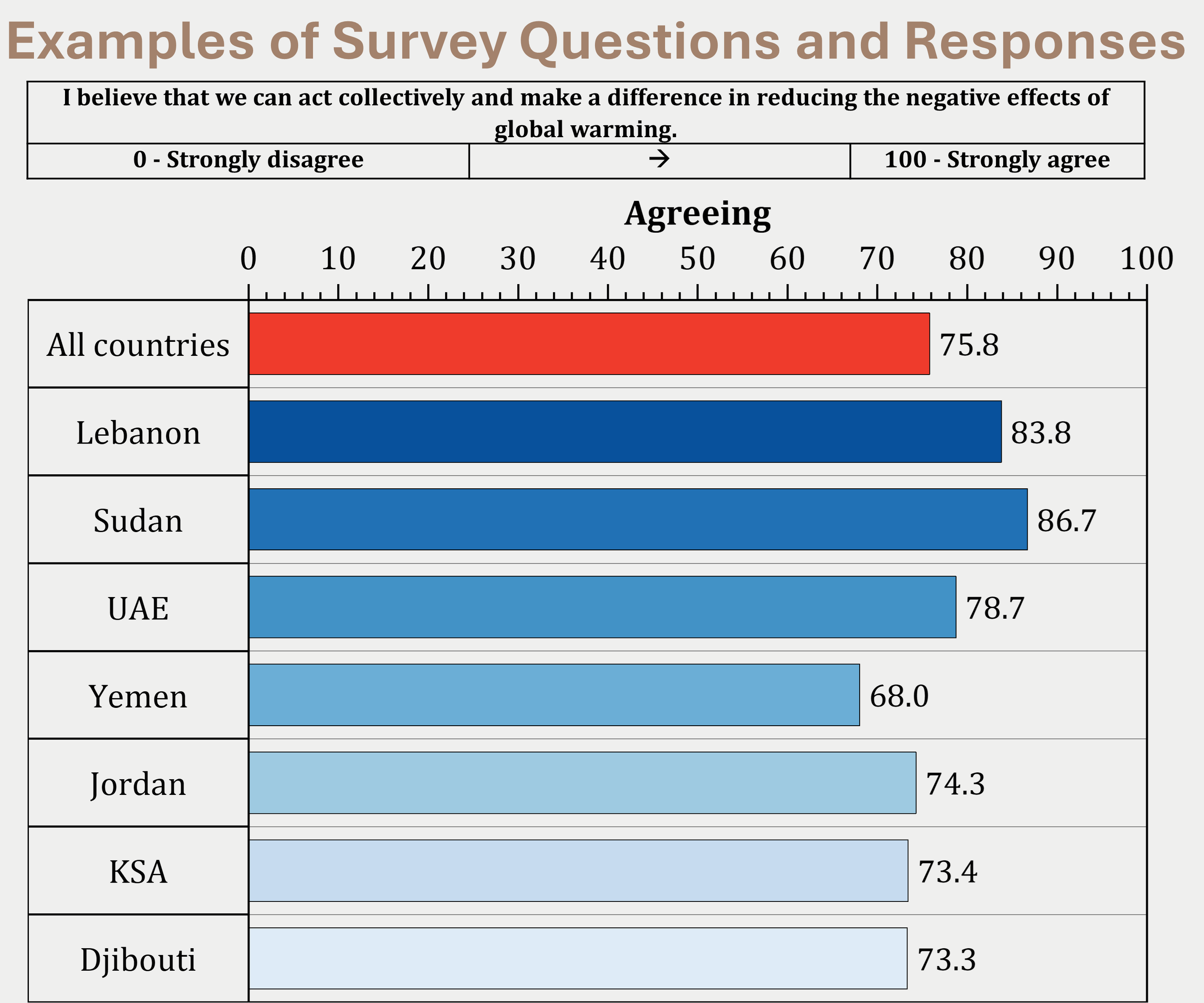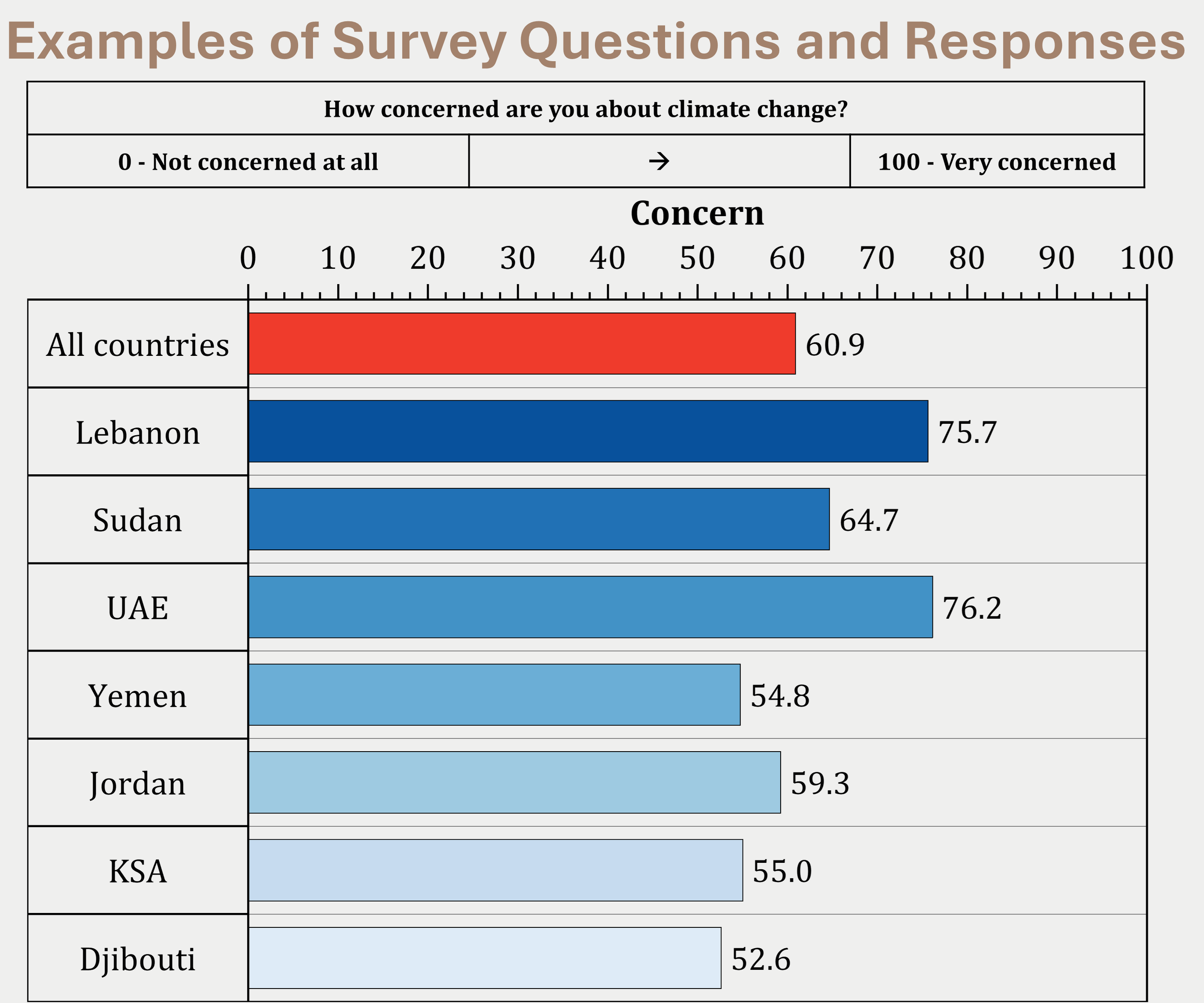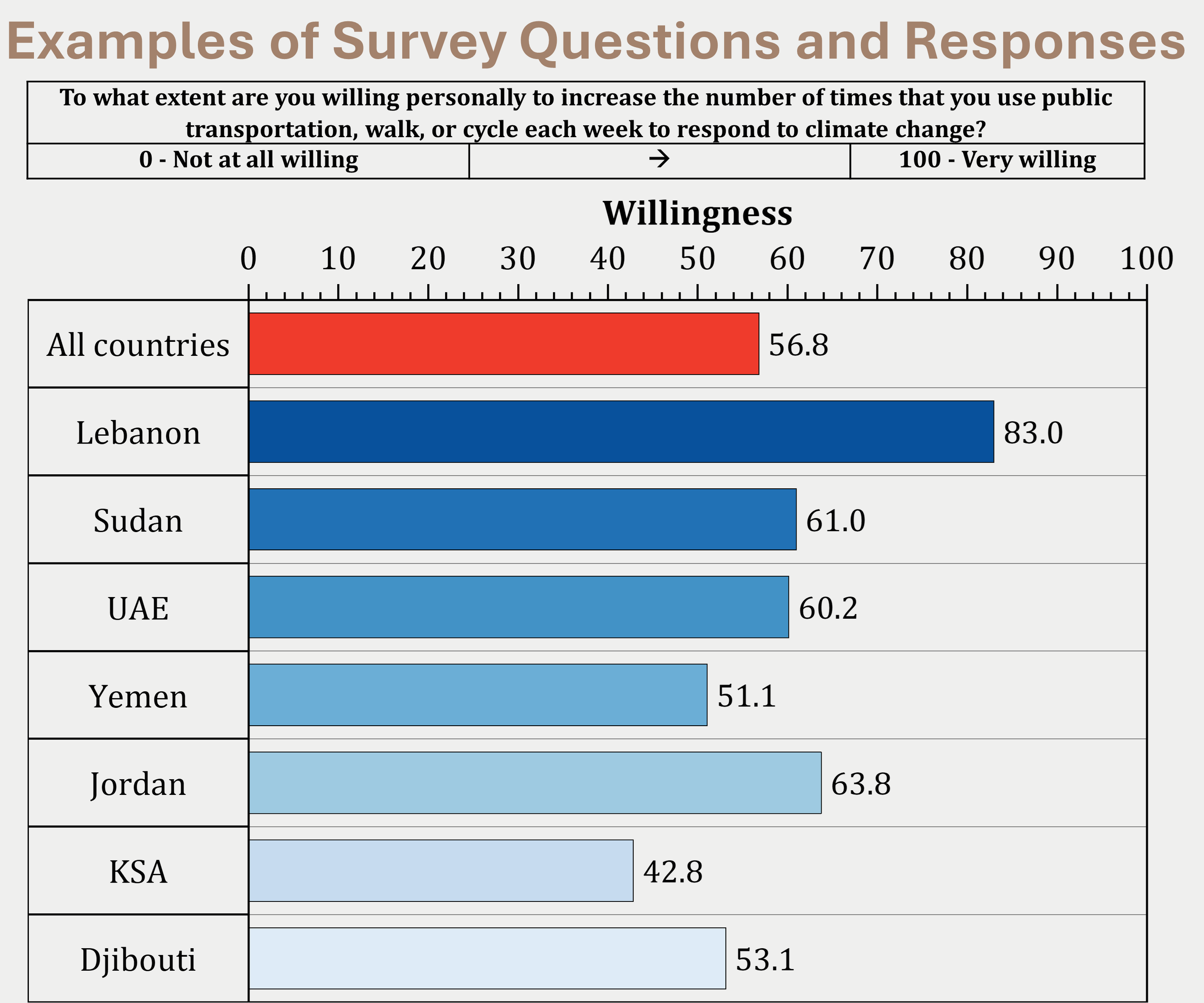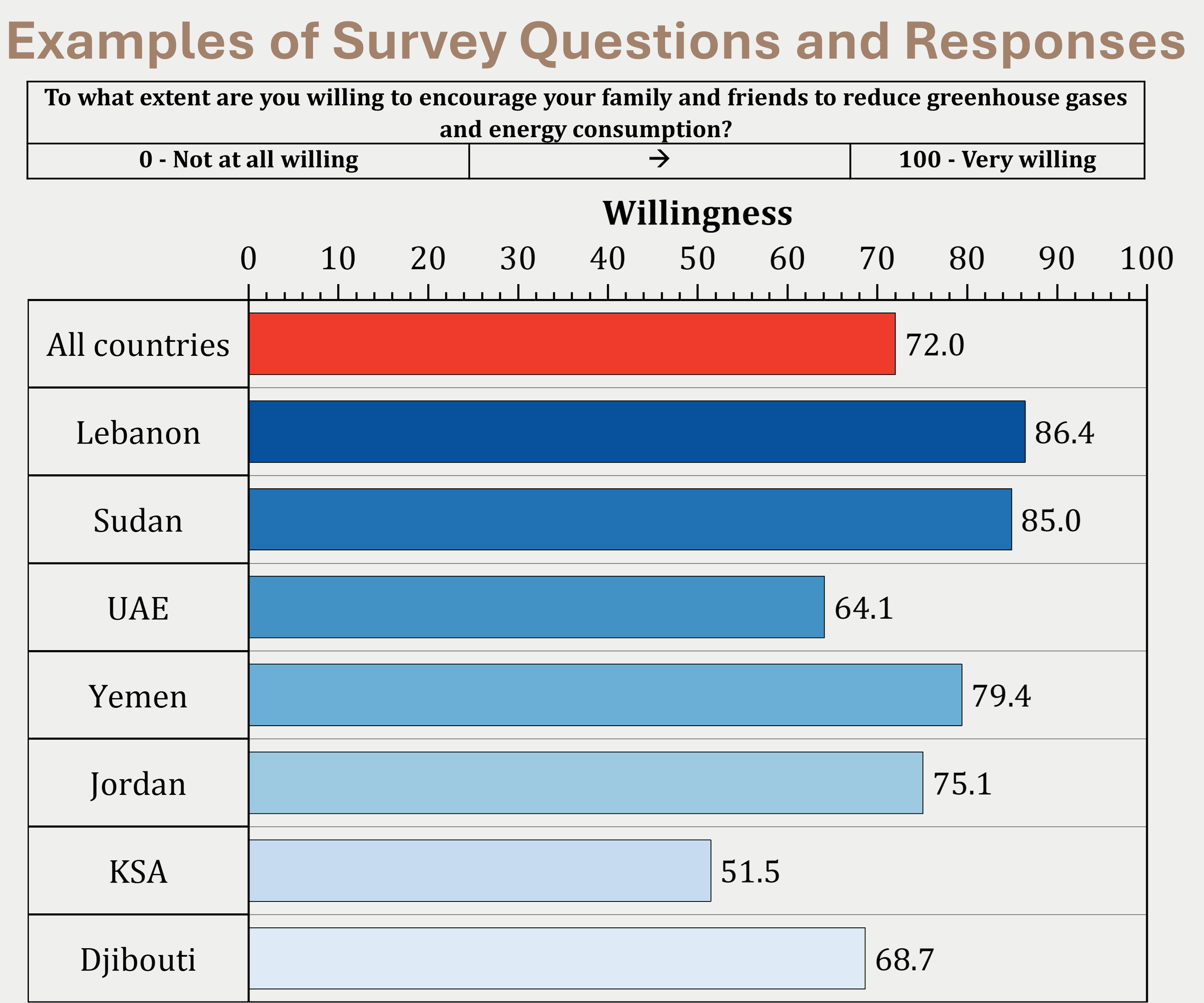 The "Perception and Willingness" study explored the climate change risk perception among youth located across the Red Sea Arena and their willingness to engage in the climate change mitigation behaviors in a globally comparative and comprehensive fashion. This study was conducted in Djibouti, Jordan, Lebanon, Saudi Arabia, Sudan, the United Arab Emirates, and Yemen, where it targeted high school and undergraduate degree students as an accessible and representative population of youth in the countries surrounding the Red Sea region, using an online self-administered questionnaire or, where necessary, phone interviews administered by a survey firm. In most countries, local internet access in major urban areas was adequate for the survey’s scope.