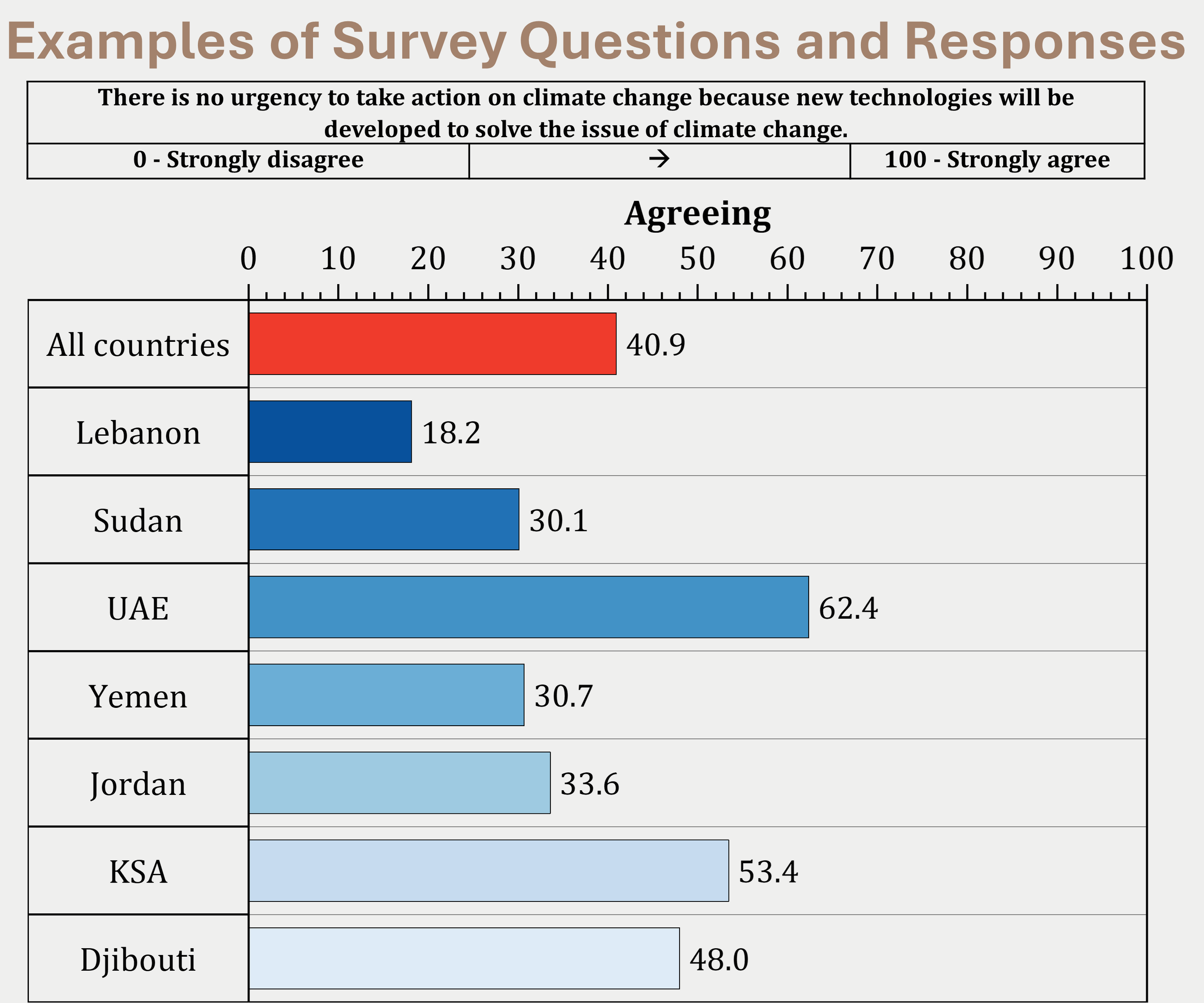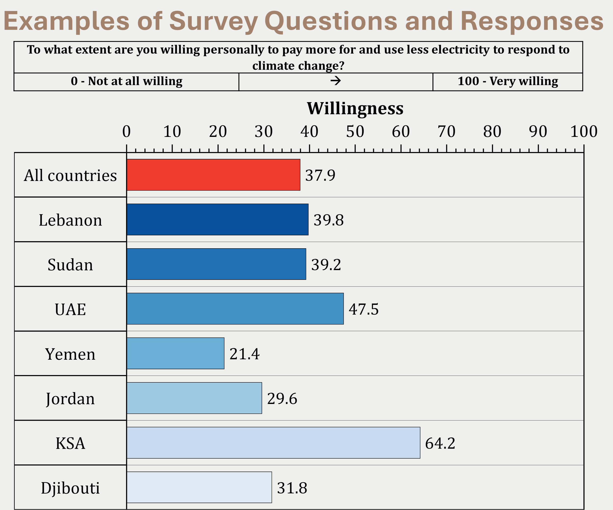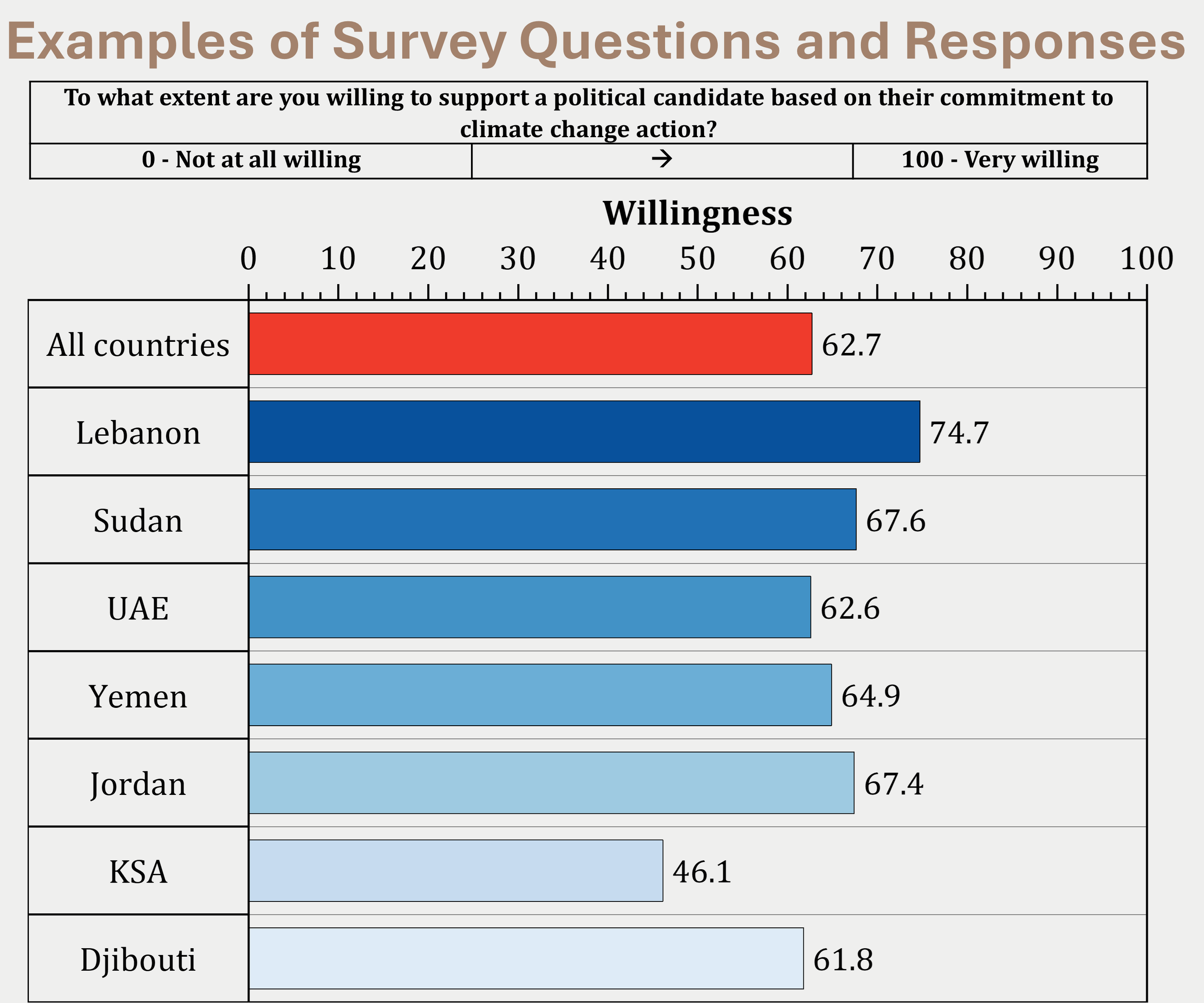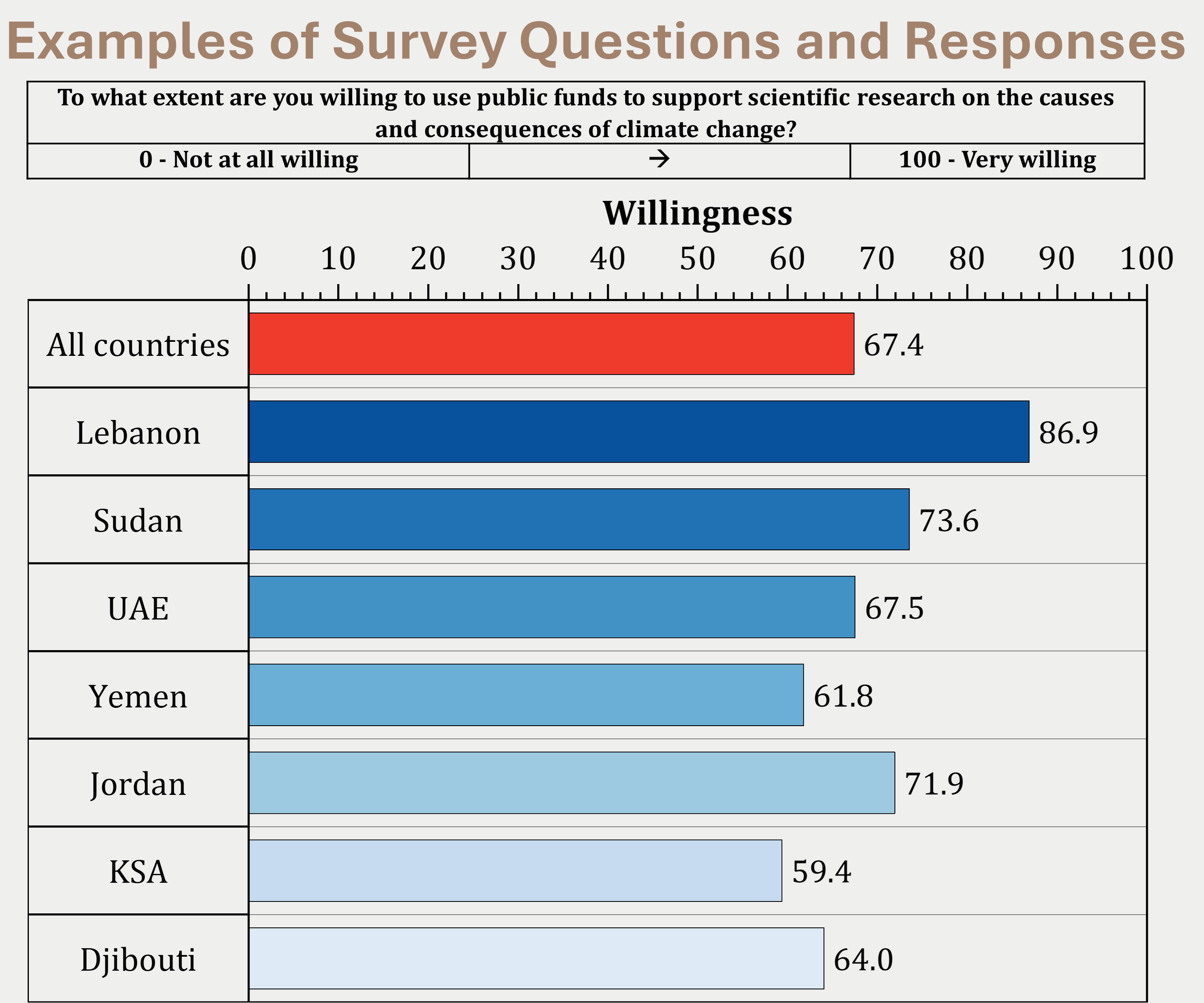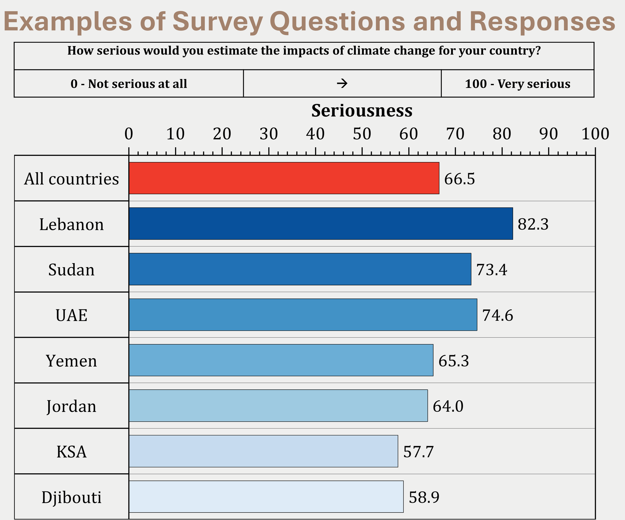 The "Perception and Willingness" study explored the climate change risk perception among youth located across the Red Sea Arena and their willingness to engage in the climate change mitigation behaviors in a globally comparative and comprehensive fashion. This study was conducted in Djibouti, Jordan, Lebanon, Saudi Arabia, Sudan, the United Arab Emirates, and Yemen, where it targeted high school and undergraduate degree students as an accessible and representative population of youth in the countries surrounding the Red Sea region, using an online self-administered questionnaire or, where necessary, phone interviews administered by a survey firm. In most countries, local internet access in major urban areas was adequate for the survey’s scope.