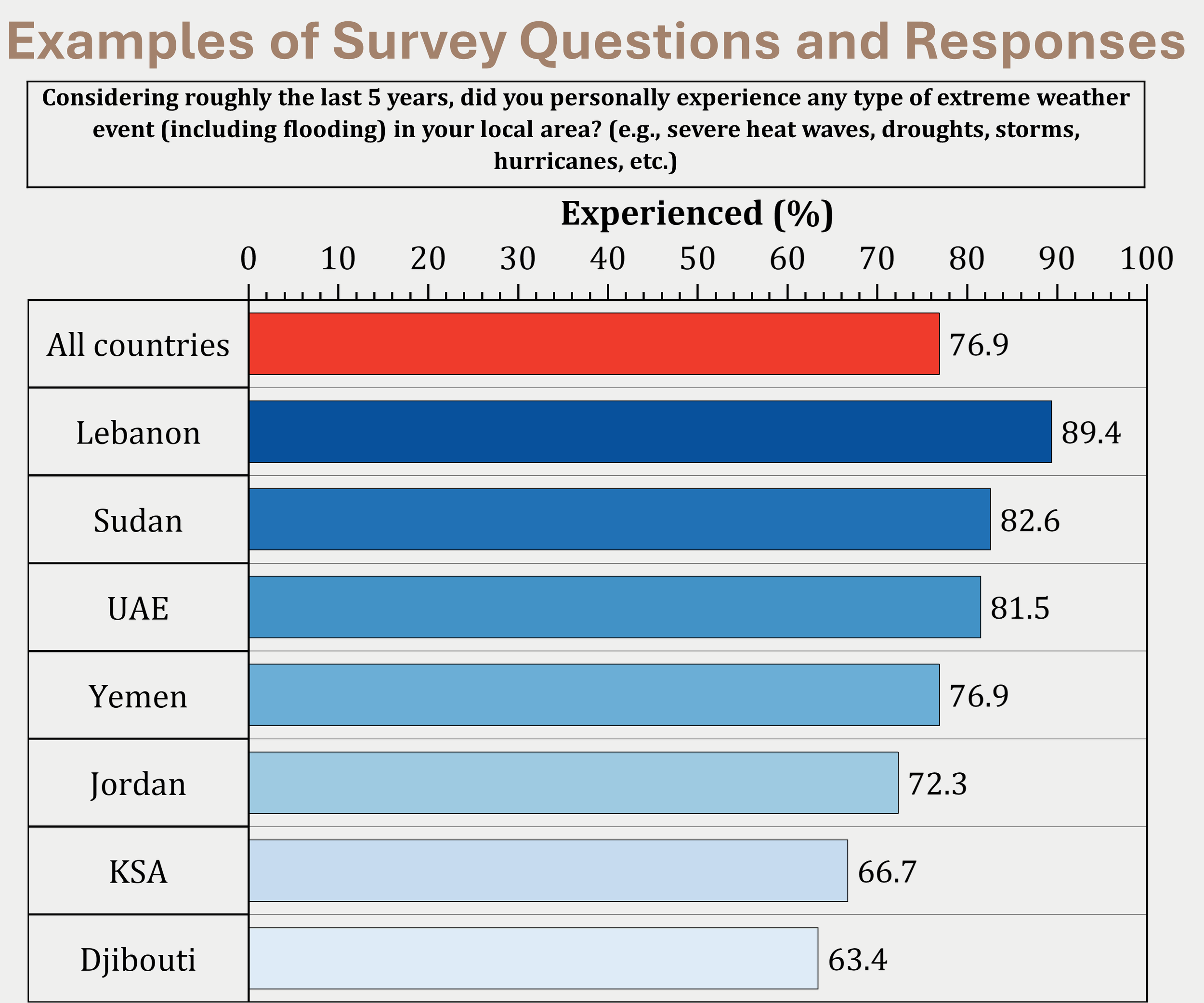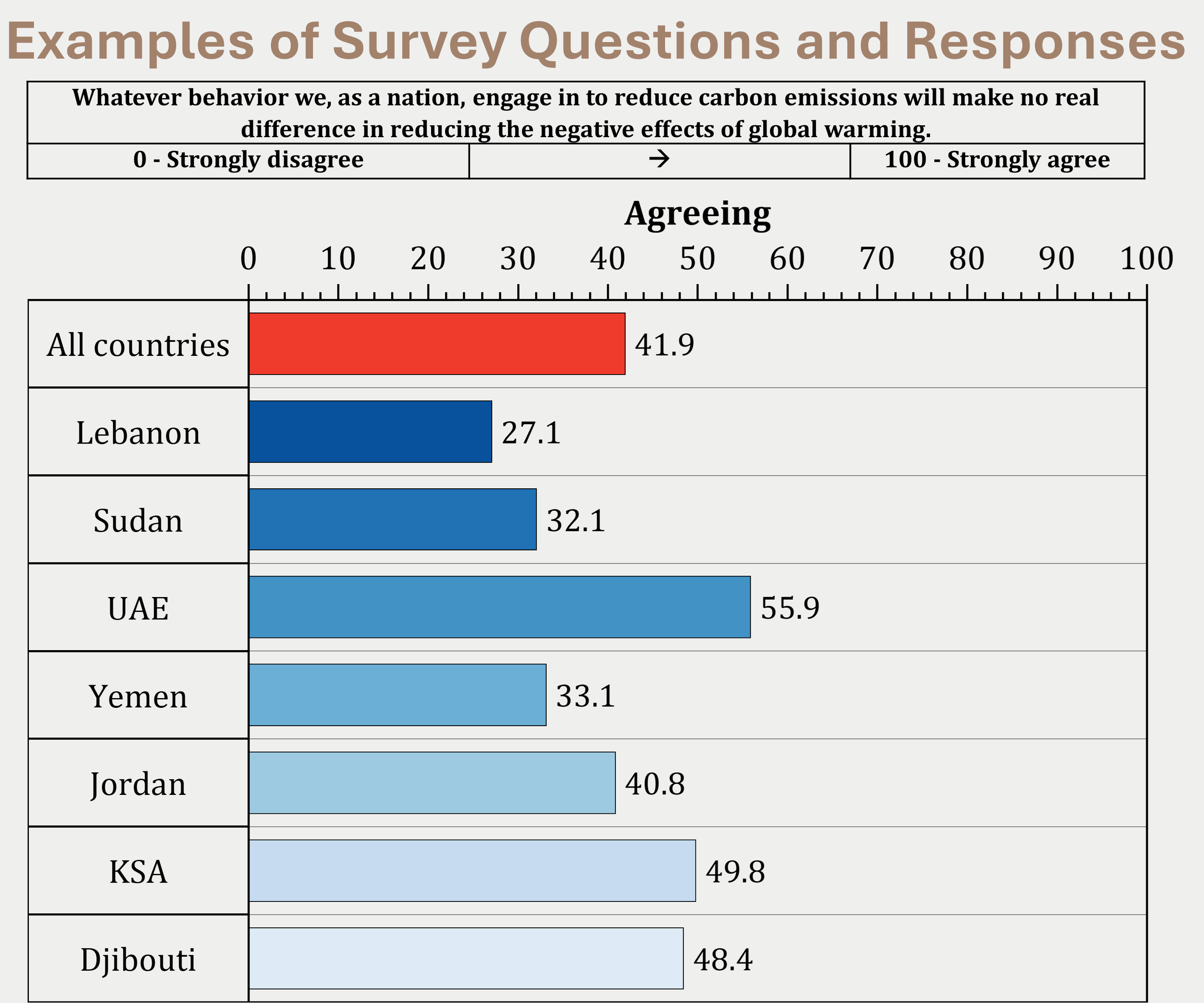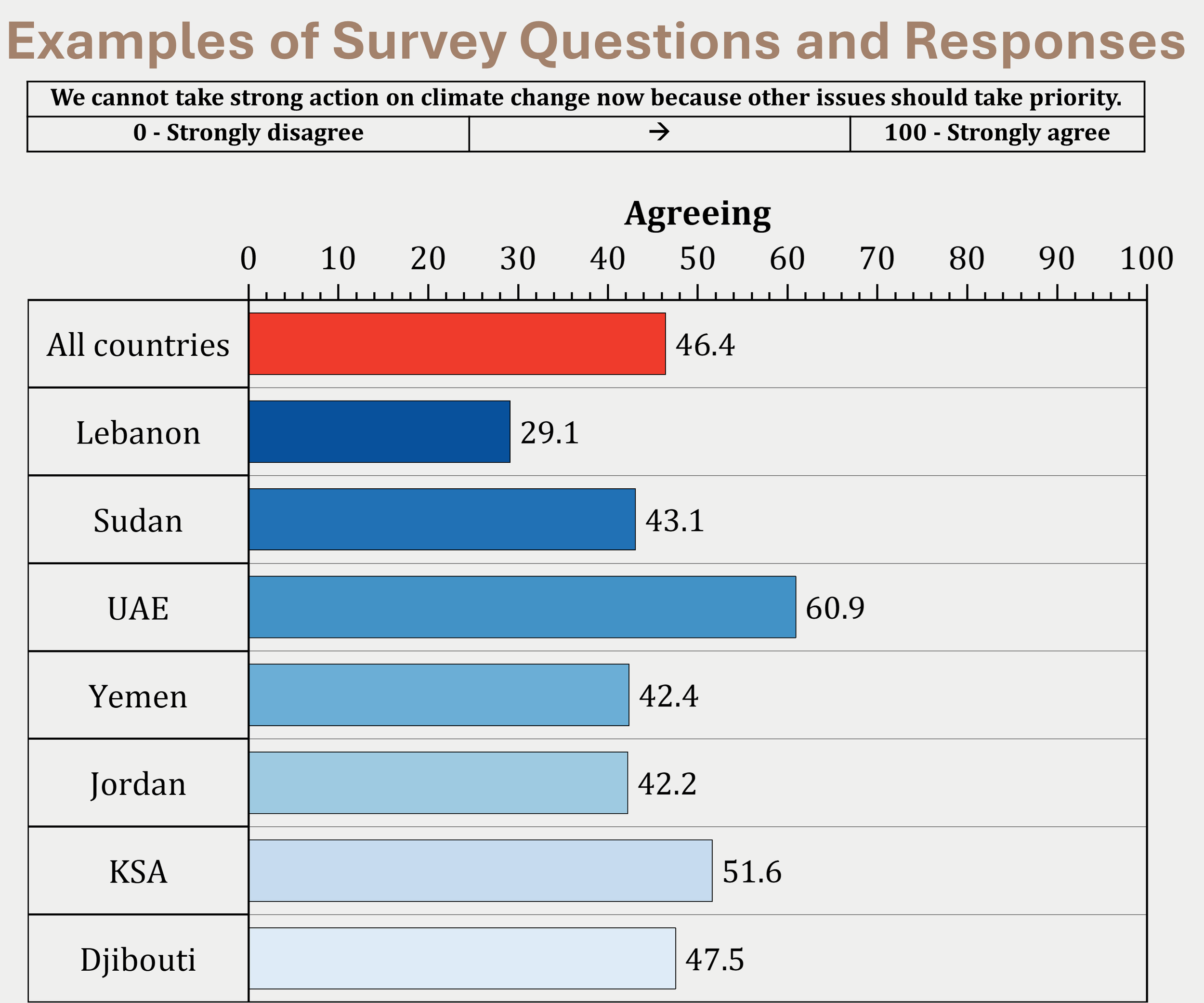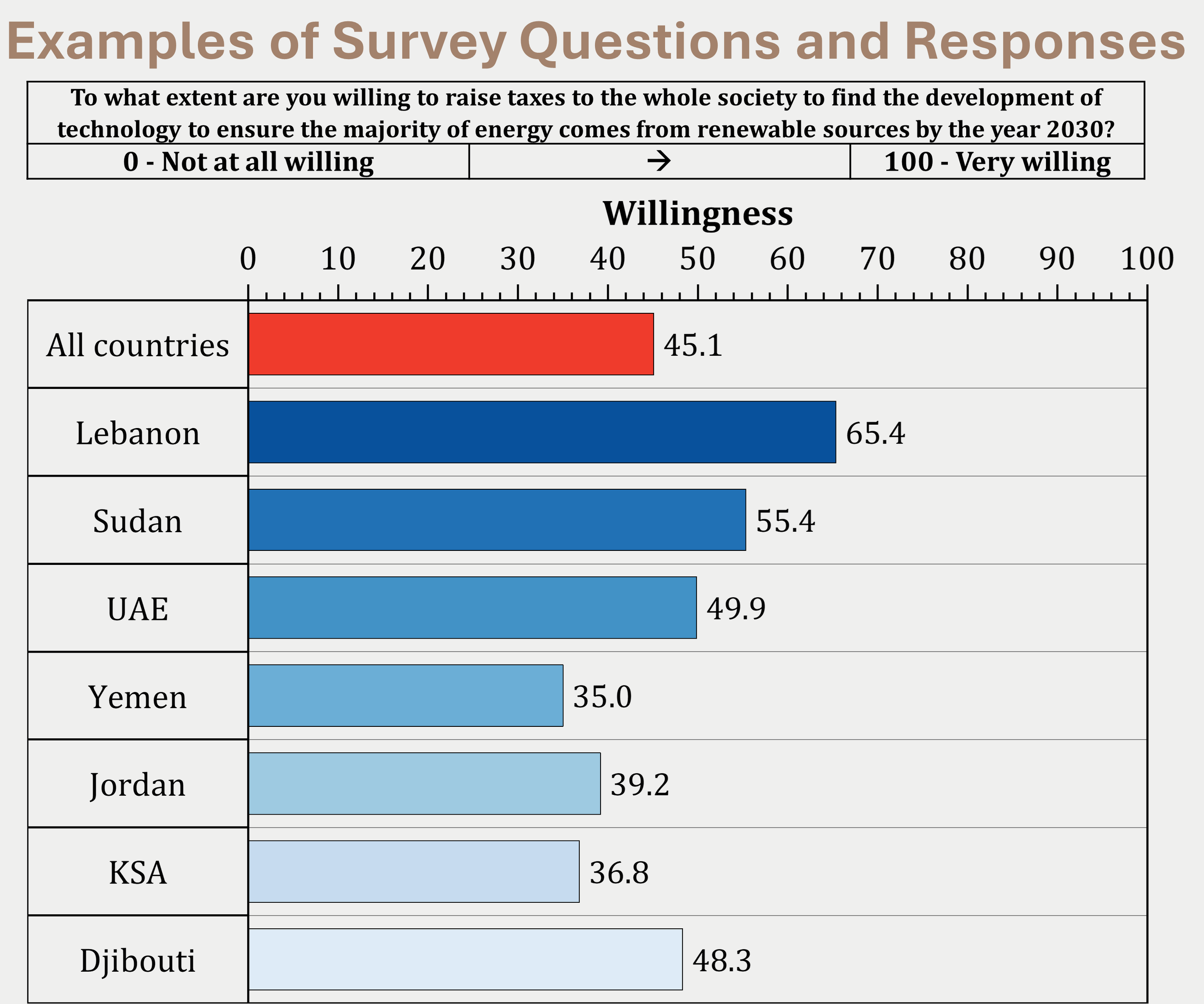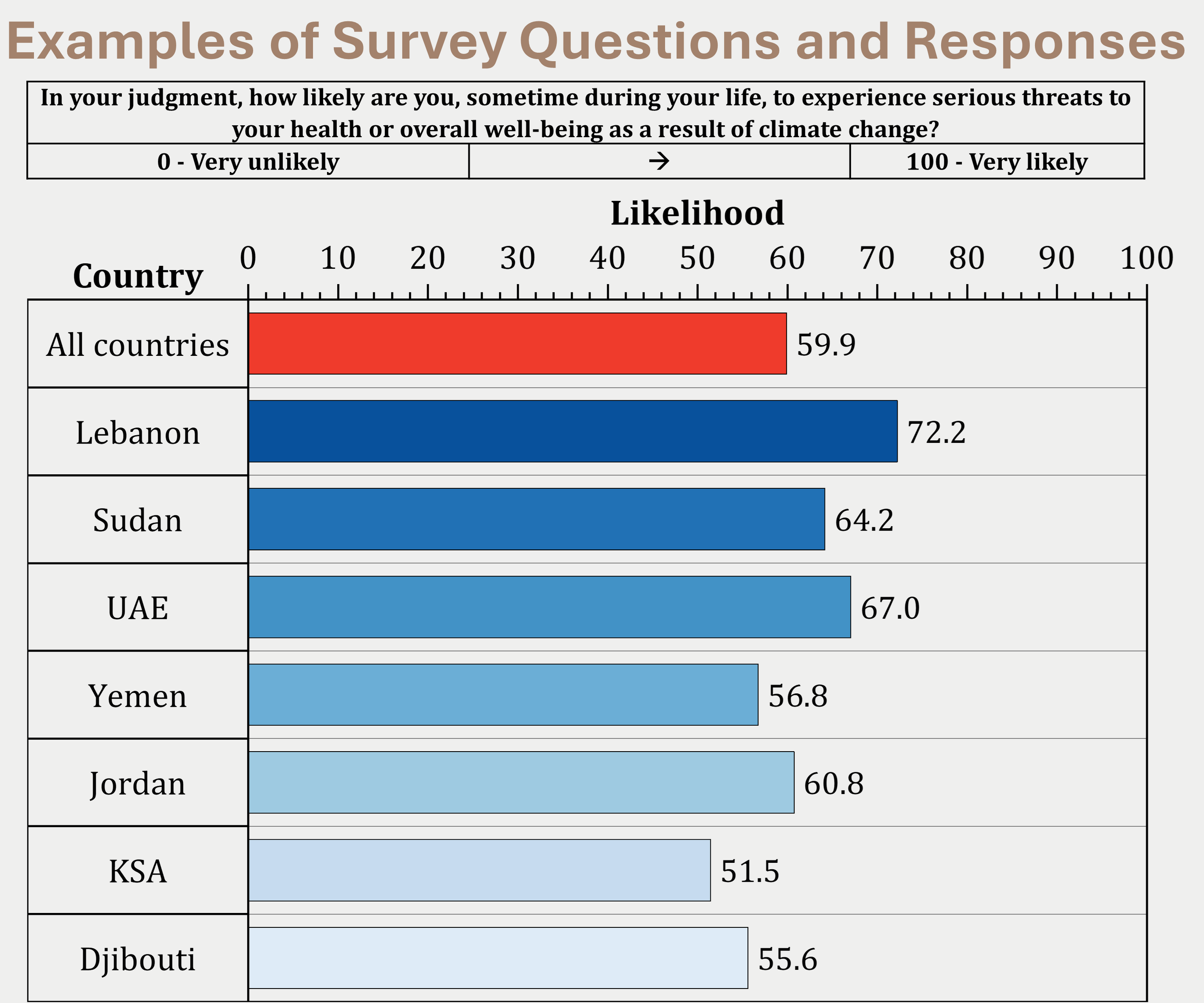 The "Perception and Willingness" study explored the climate change risk perception among youth located across the Red Sea Arena and their willingness to engage in the climate change mitigation behaviors in a globally comparative and comprehensive fashion. This study was conducted in Djibouti, Jordan, Lebanon, Saudi Arabia, Sudan, the United Arab Emirates, and Yemen, where it targeted high school and undergraduate degree students as an accessible and representative population of youth in the countries surrounding the Red Sea region, using an online self-administered questionnaire or, where necessary, phone interviews administered by a survey firm. In most countries, local internet access in major urban areas was adequate for the survey’s scope.